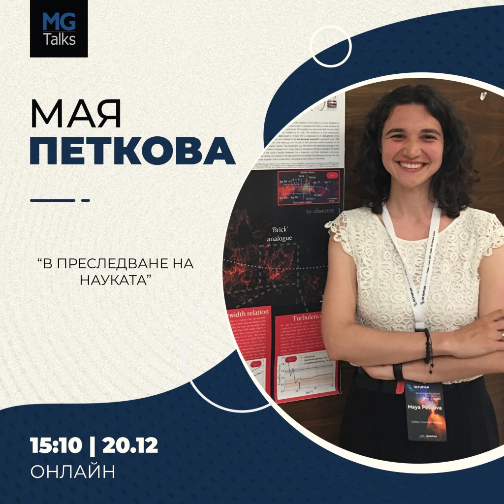След като завършва МГ през 2008 г., Мая Петкова започва да учи и да се занимава с астрофизика, като вече 15 години е научен работник. Следвайки този път, е живяла и работила в няколко европейски държави и е пътувала до различни точки по света, за да представи научния си труд и да създаде връзки за съвместна работа с други астрофизици. В презентацията си ще разкаже за това какво е да се занимаваш с наука в Европа и ще сподели какво е научила през годините. Освен това ще говори за младите звезди в сърцето на Млечния път, за черните дупки в ранната вселена и за това как изучава света с помощта на компютърни модели.